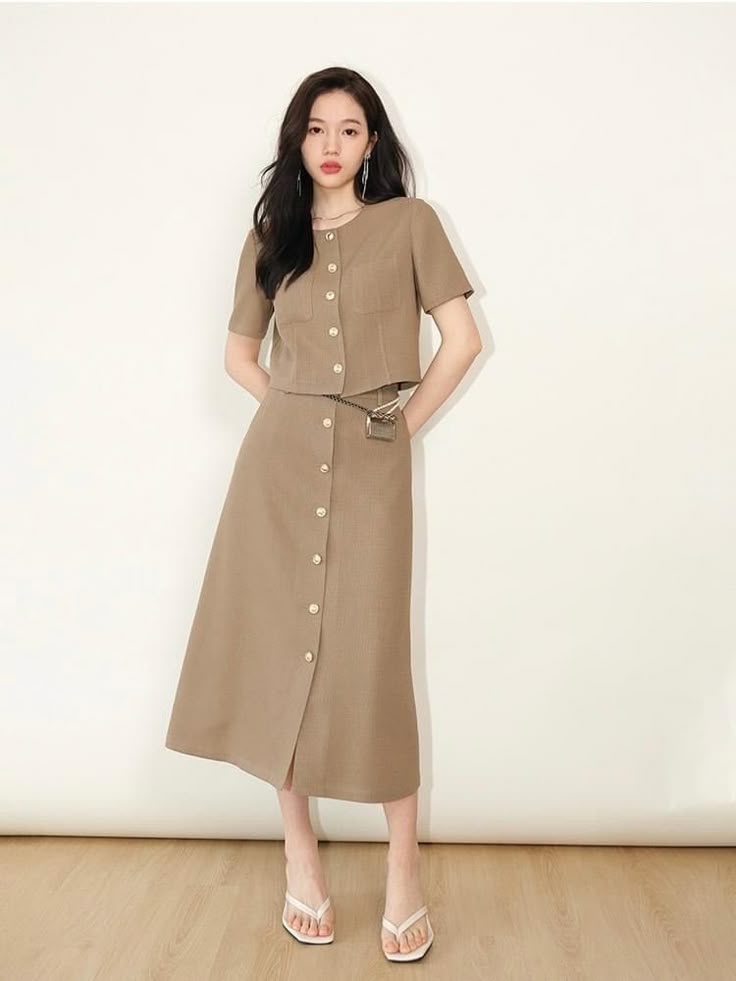 Paired perfectly with a high-waisted midi skirt, the design continues with a matching fabric and a front-button closure that creates a seamless, coordinated flow.